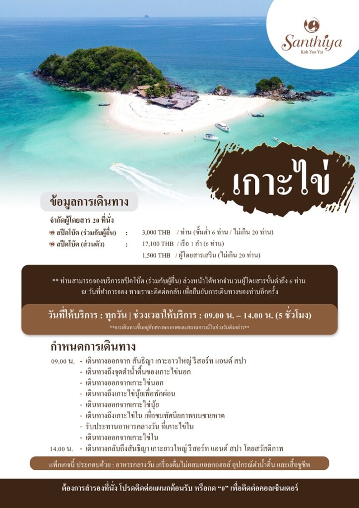 เดินทางโดยสปีดโบ๊ท:  3,000 บาท/ท่าน (ขั้นต่ำ 6 ท่าน / ไม่เกิน 20 ท่าน)