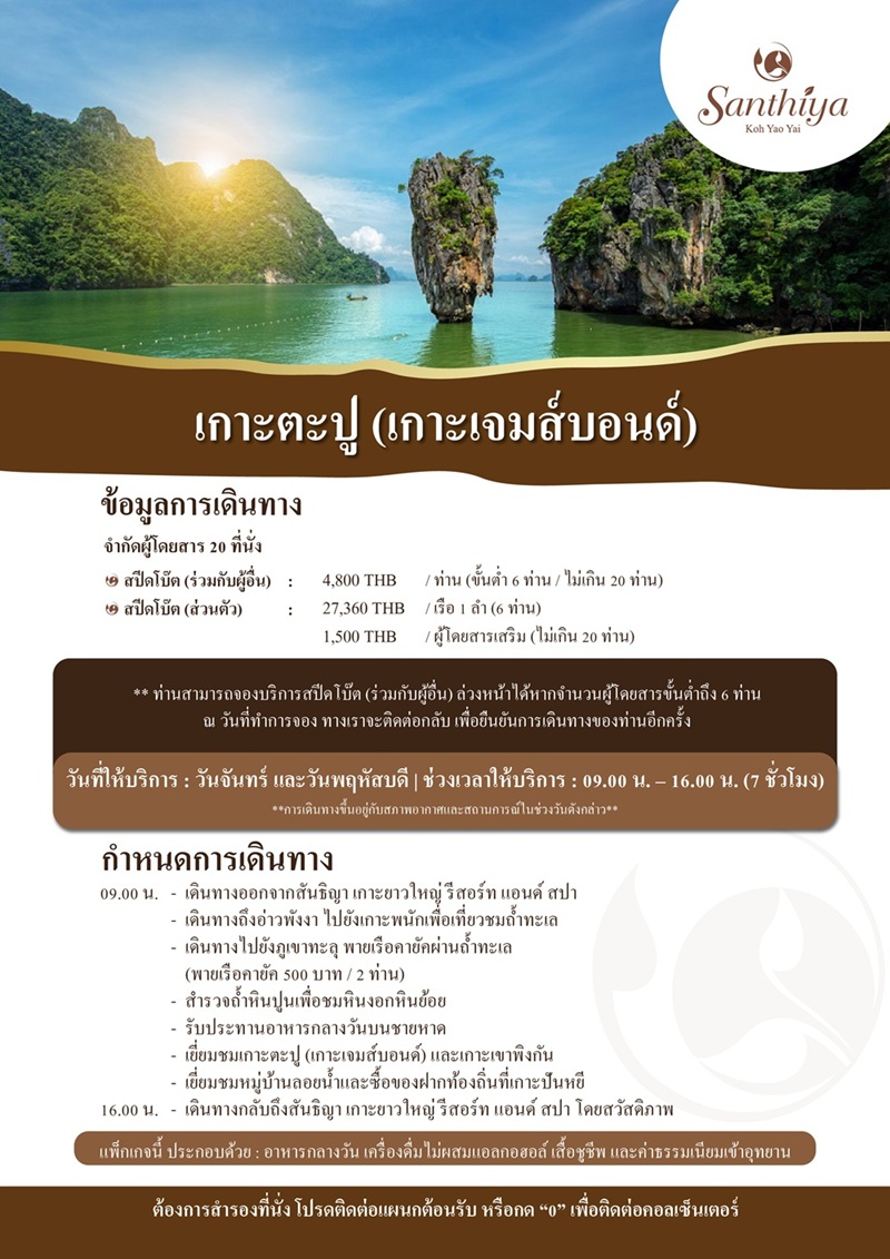 เดินทางโดยสปีดโบ๊ท: 4,800 บาท/ท่าน (ขั้นต่ำ 6 ท่าน / ไม่เกิน 20 ท่าน)