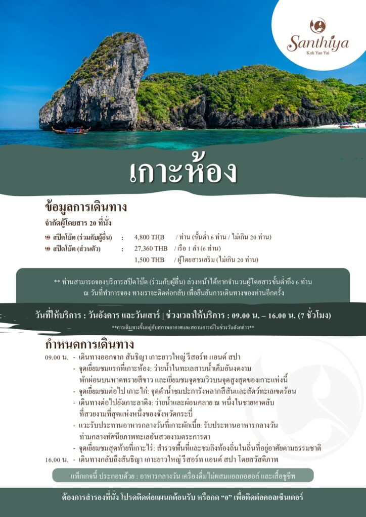 เดินทางโดยสปีดโบ๊ท:4,800 บาท / ท่าน (ข้ั้นต่ำ 6 ท่าน / ไม่เกิน 20 ท่าน)