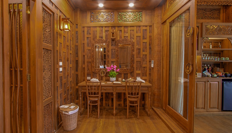 King Pavilion is a luxurious 145 sq.m. suite, situated in close proximity to the beachfront and exquisitely furnished with unique traditional Thai-style decor and intricate teakwood carvings. The spacious layout includes a large dining and living area, which is perfect for relaxation, along with two separate bedrooms, making it ideal for small groups of guests.