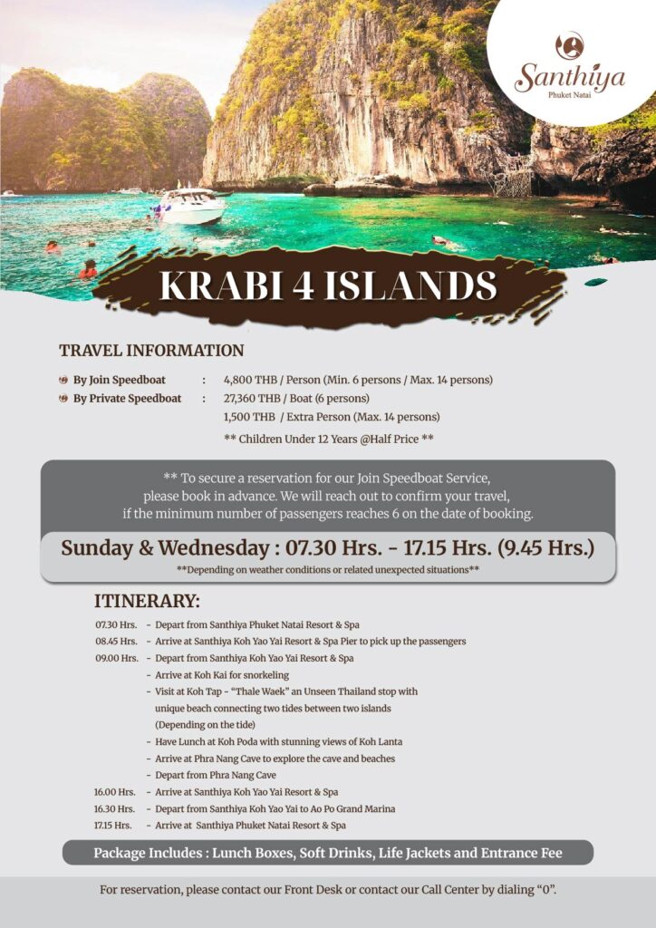 This excursion offers a glimpse of our neighbouring province, Krabi. Included during the trip are smaller locations such as Koh Kai (Chicken Island), Koh Tap, Koh Poda, and Railay Bay. The emerald waters and white sand beaches offer the perfect afternoon of snorkeling and lounging in the sun while experiencing some of the lesser-known islands in Krabi.